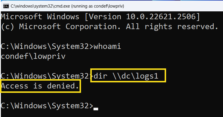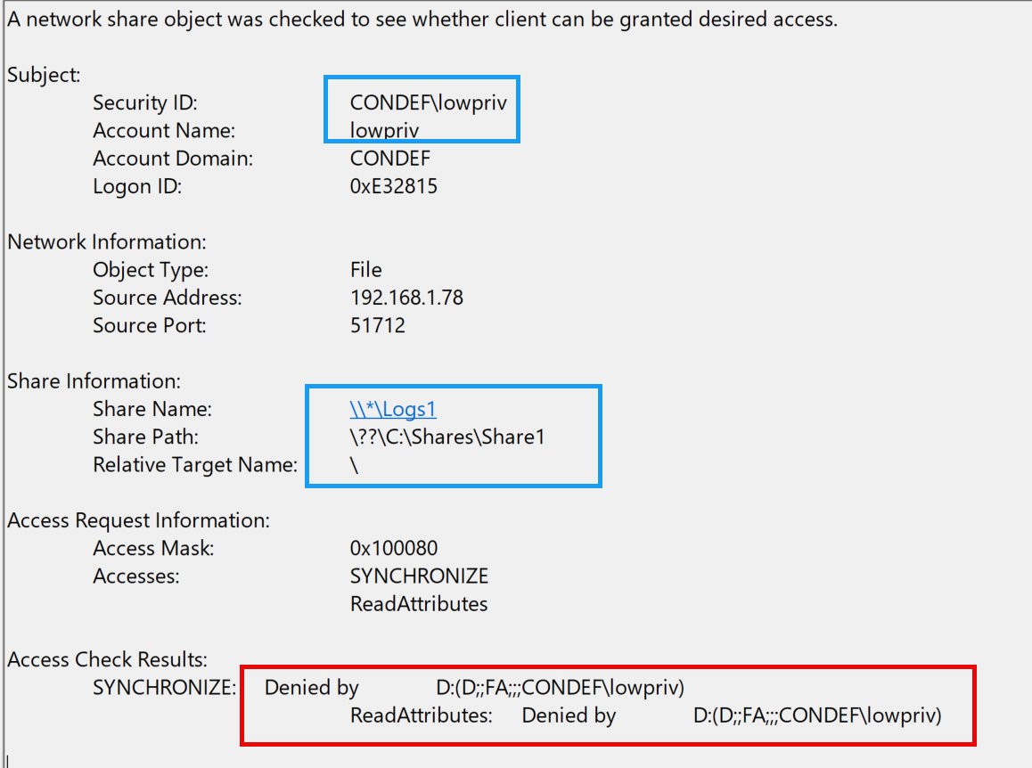 And looking at the results, we see that the low priv user has failed to access all the "Logs" file shares that we created earlier ( and explicitly denied the lowpriv user access to ):