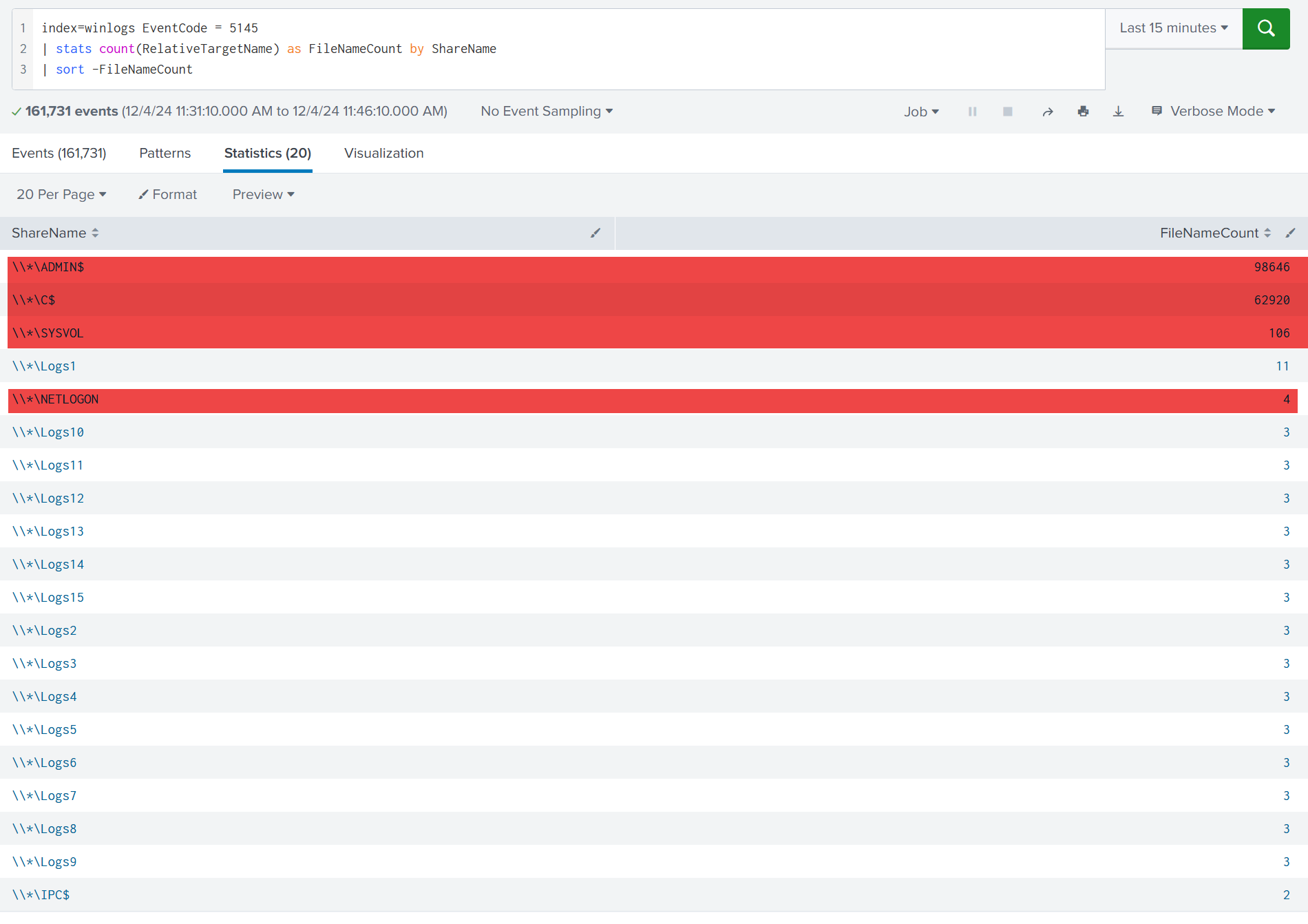 | sort -FileNameCountThis query will look at the 5145 event ID that we've been looking at so far and then will count the number of times a particular share was accessed: