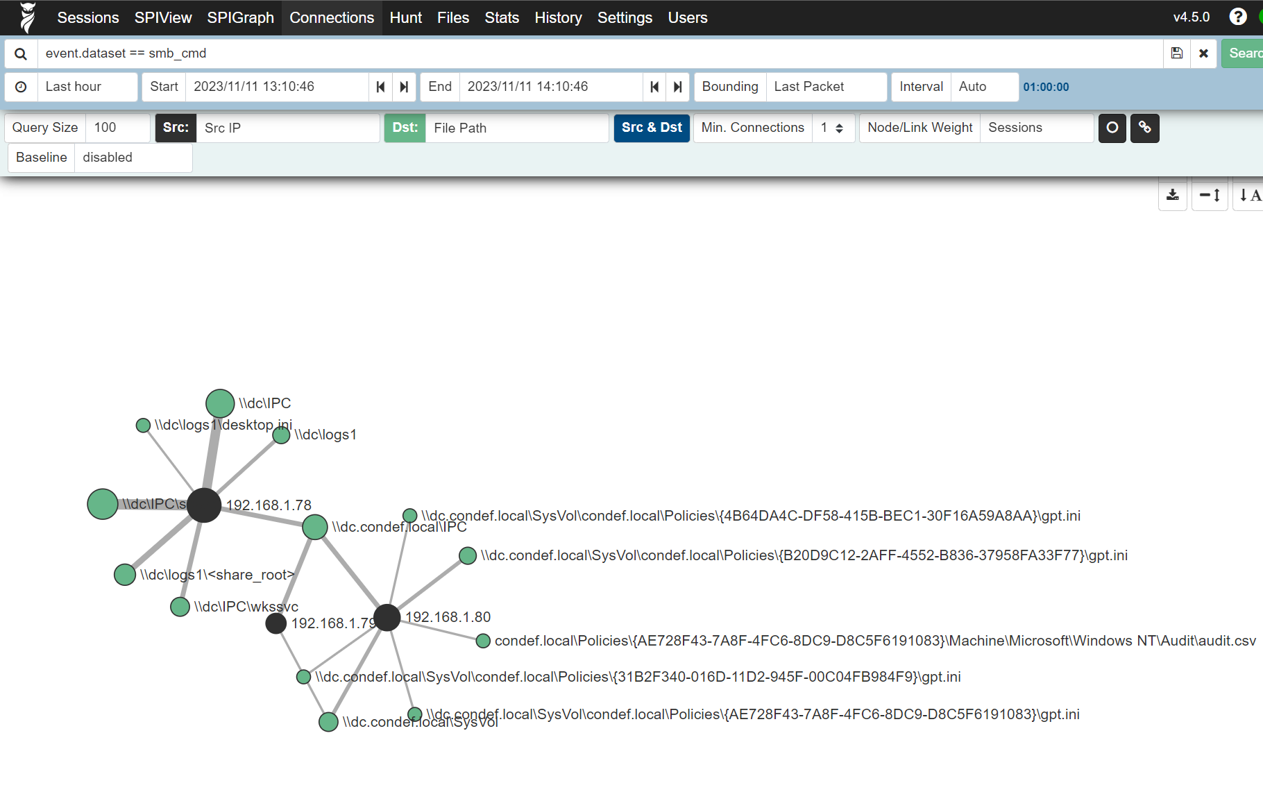 Now if we tweak our search to only contain event.dataset == smb_cmd the graph will contain all the SMB events, graphing out the source IP and file path fields: