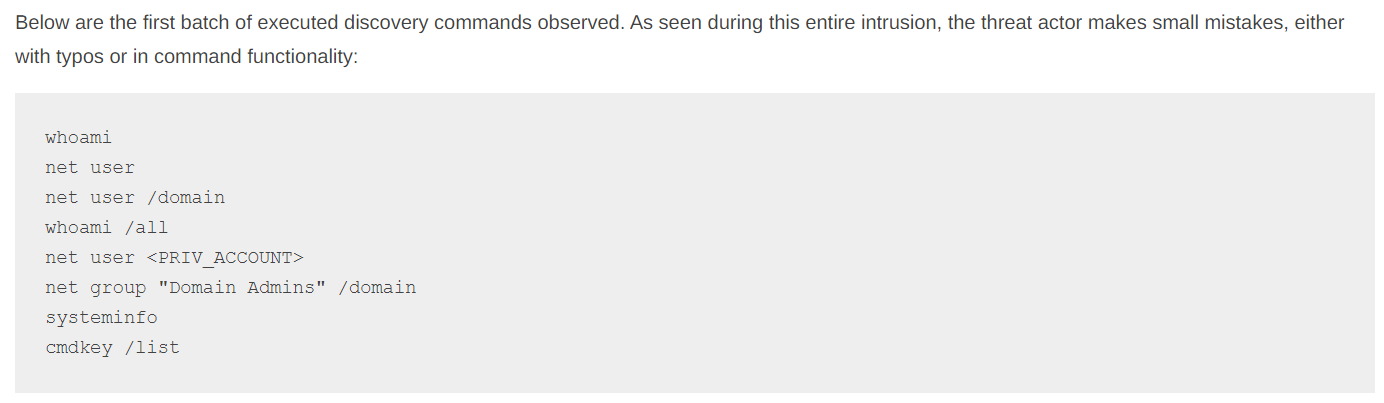 Looking at one of the fantastic DFIR Report write-ups ( https://thedfirreport.com/2023/10/30/netsupport-intrusion-results-in-domain-compromise/ ), we can get a quick since of what discovery looks like when executed by a threat actor: